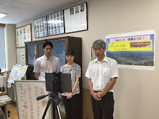 また、現在佐治小学校の先生方が、オンライン授業を行うために千代南中学校にいらっしゃいます。児島校長先生、角脇先生、大門先生が代表して、中学生たちに挨拶をしてくださいました。
